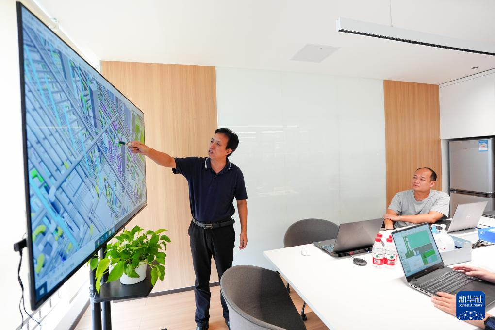 2024年8月26日,中国电子院工作人员利用数字孪生模型讨论某半导体项目纯水系统方案。新华社记者 鞠焕宗 摄