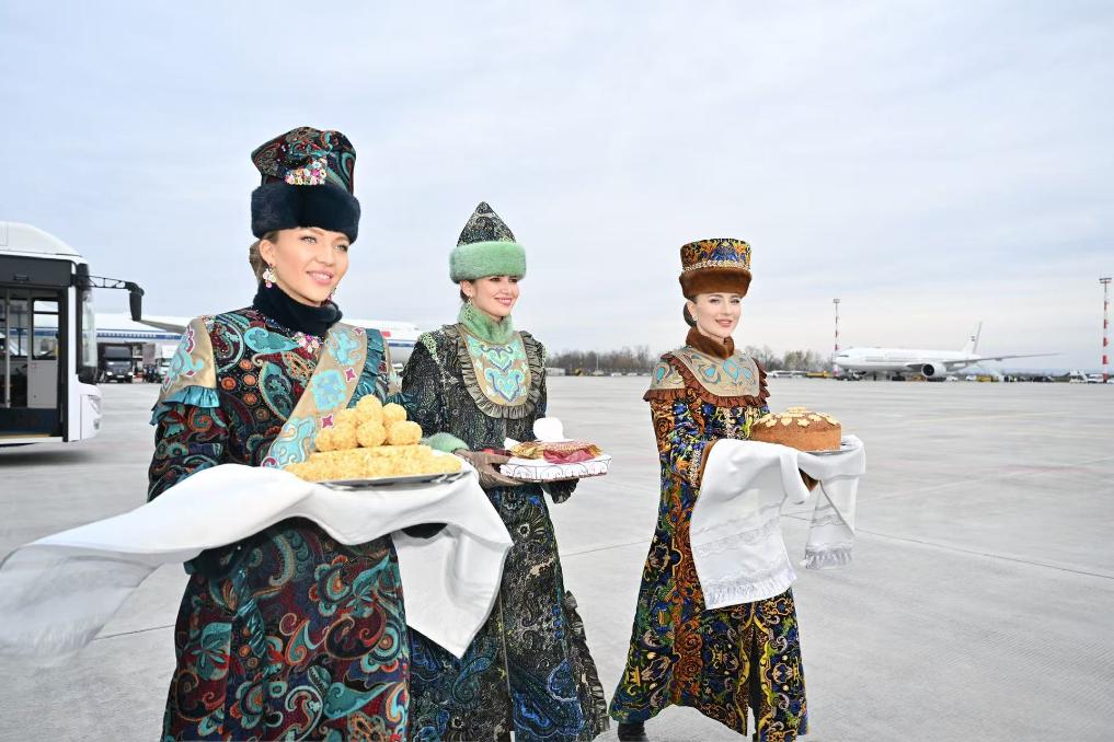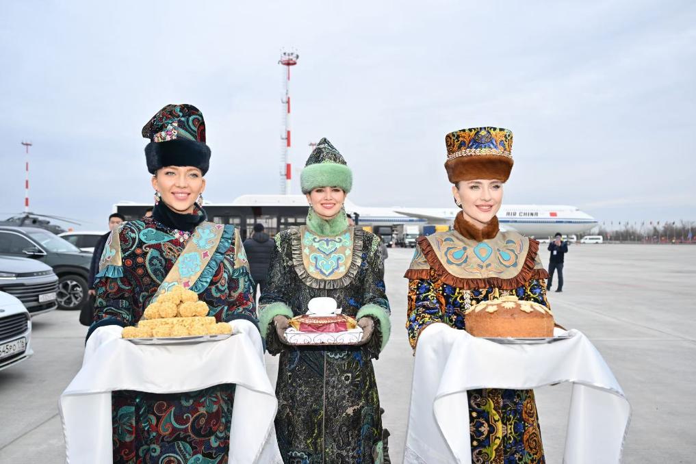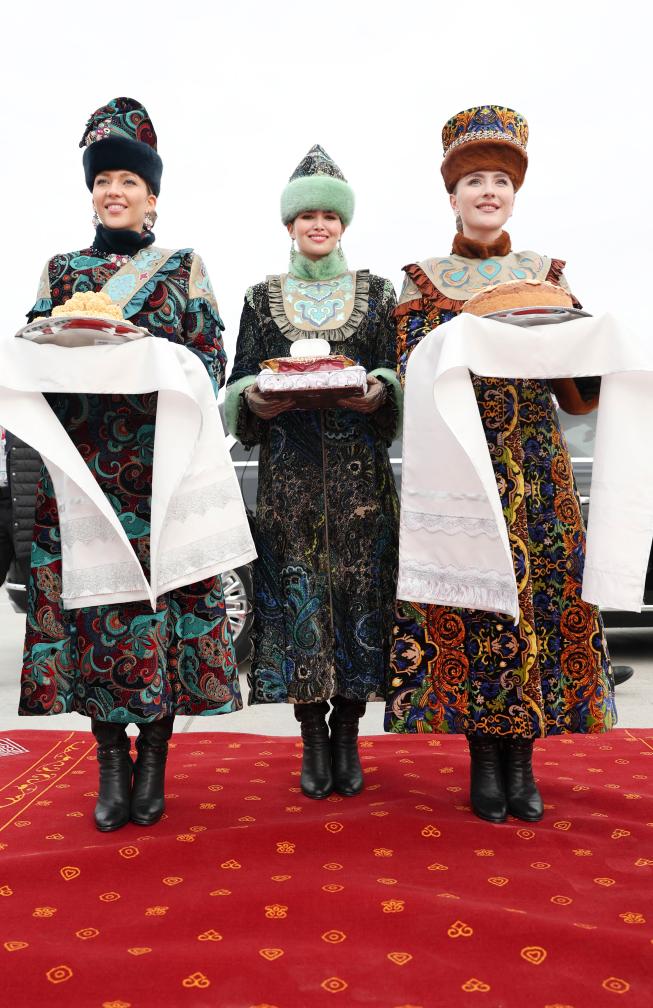 专机抵达喀山国际机场时,俄罗斯联邦鞑靼斯坦共和国行政长官明尼哈诺夫、共和国总理佩索申、喀山市市长梅特申和俄罗斯外交部高级官员在机场热情迎接。