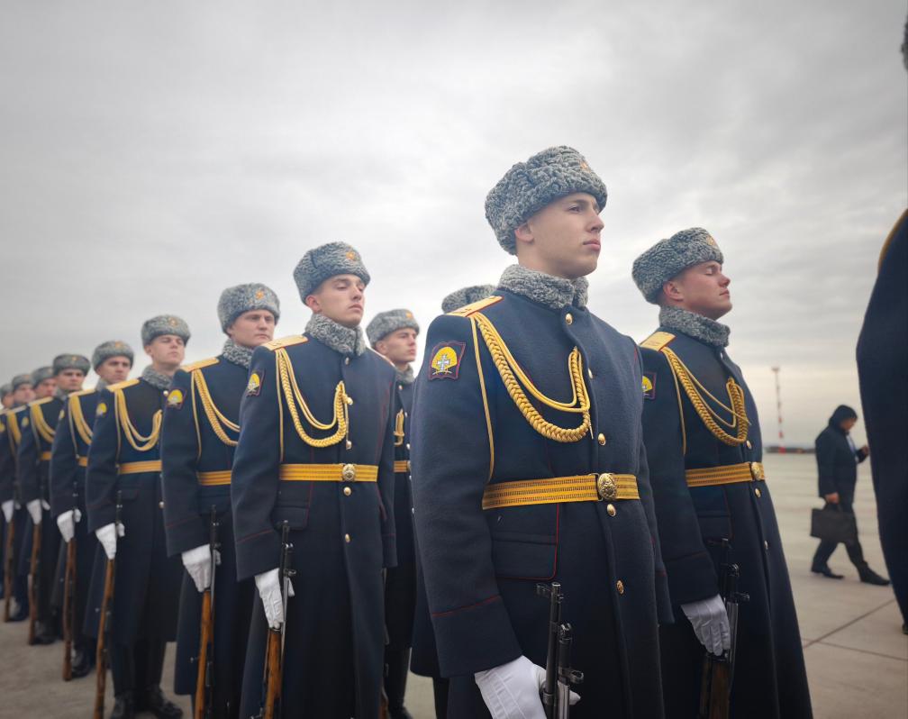 礼兵在红毯两侧列队致敬,身着民族服装的俄罗斯女青年用传统礼节表示欢迎。