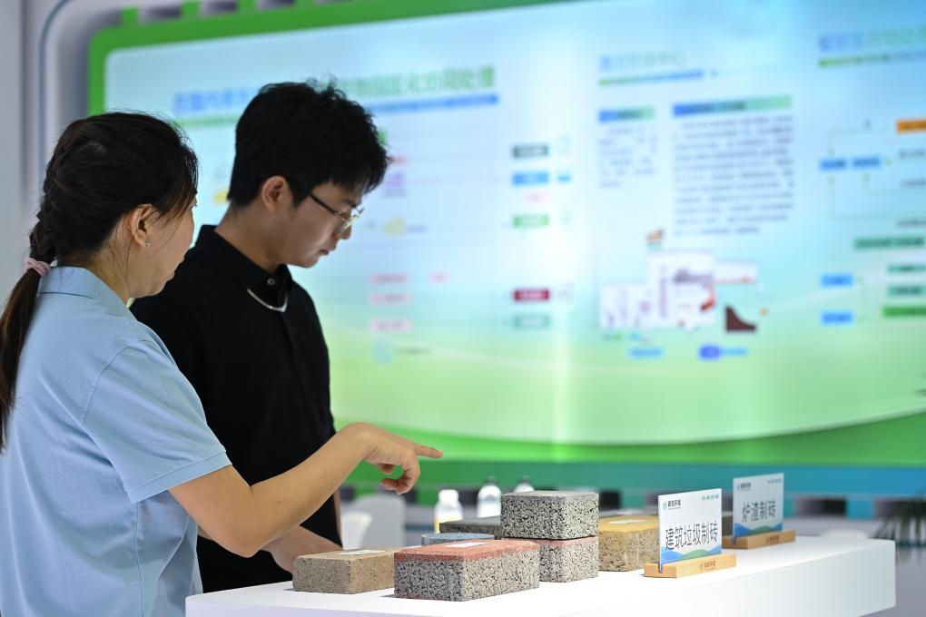 9月14日,参观者在服贸会首钢园区朝阳环境展台了解北京朝阳循环经济产业园利用建筑垃圾生产的再生砖。新华社记者 李鑫 摄