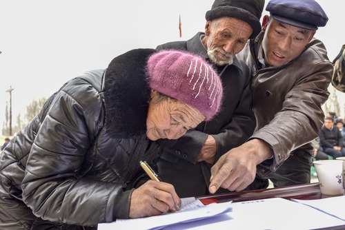 2018年,在新疆阿克陶县,村民吐尔荪罕·库万(前)正在签字领取托养毛驴所得的分红资金。桌上的白纸正好成为了完美的反光板,照亮了她面部的细节。
