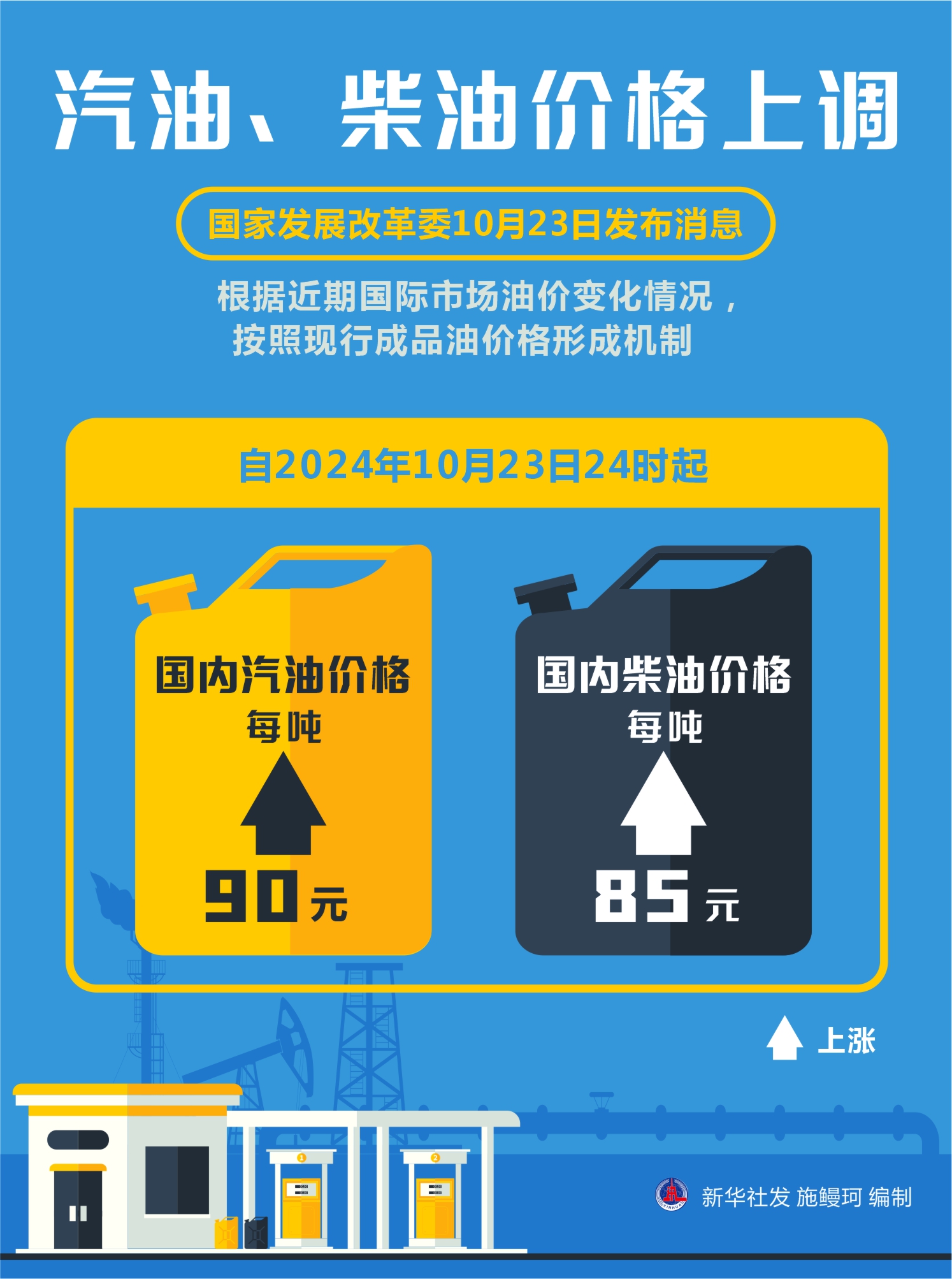 新华社北京10月23日电(记者陈炜伟、胡旭)国家发展改革委23日发布消息,根据近期国际市场油价变化情况,按照现行成品油价格形成机制,自2024年10月23日24时起,国内汽、柴油价格每吨分别上涨90元和85元。