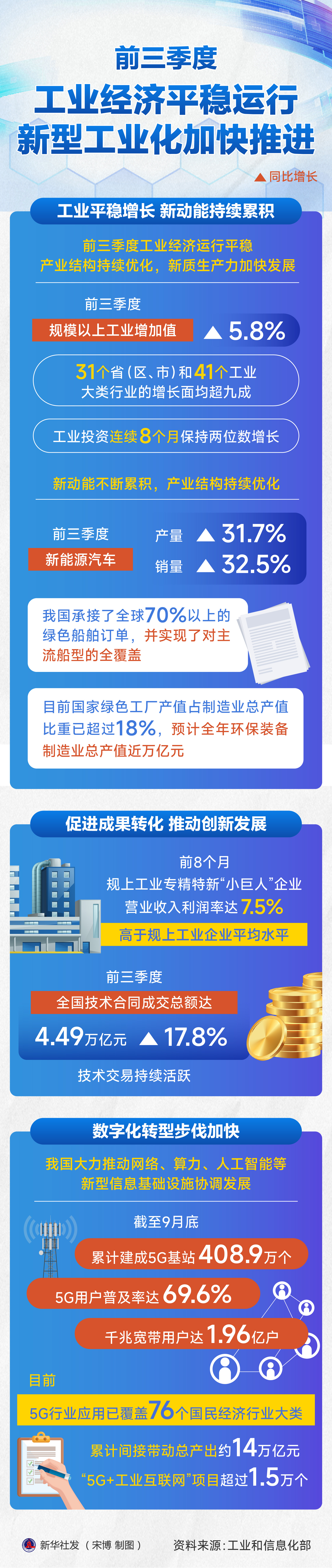 新华社北京10月23日电 题:前三季度:工业经济平稳运行,新型工业化加快推进