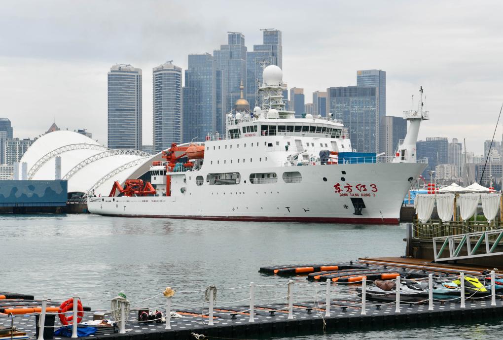 中国海洋大学“东方红3”新型深远海综合科考实习船靠泊青岛奥帆中心母港(2024年10月21日摄)。