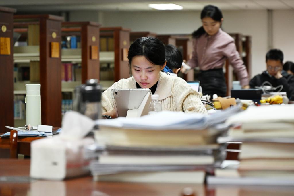 2024年10月21日,中国海洋大学崂山校区,学生在图书馆上自习。
