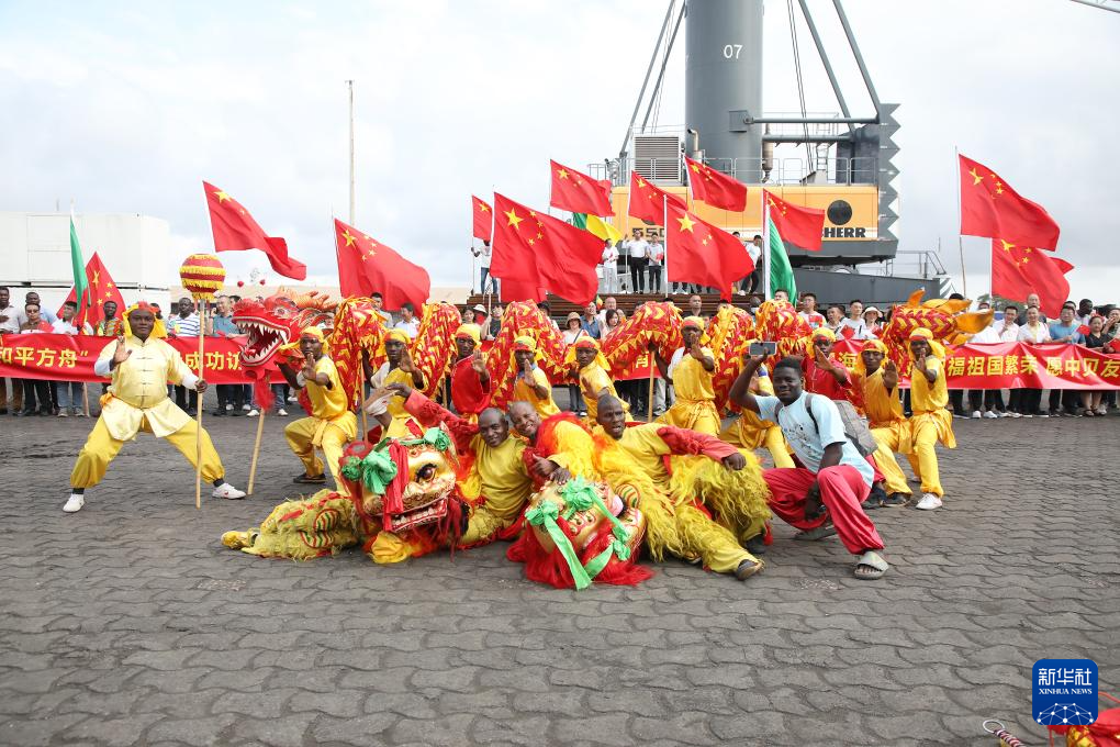 10月24日,中国海军“和平方舟”号医院船驶离贝宁科托努港码头。这是欢送仪式现场。新华社发(刘志磊摄)