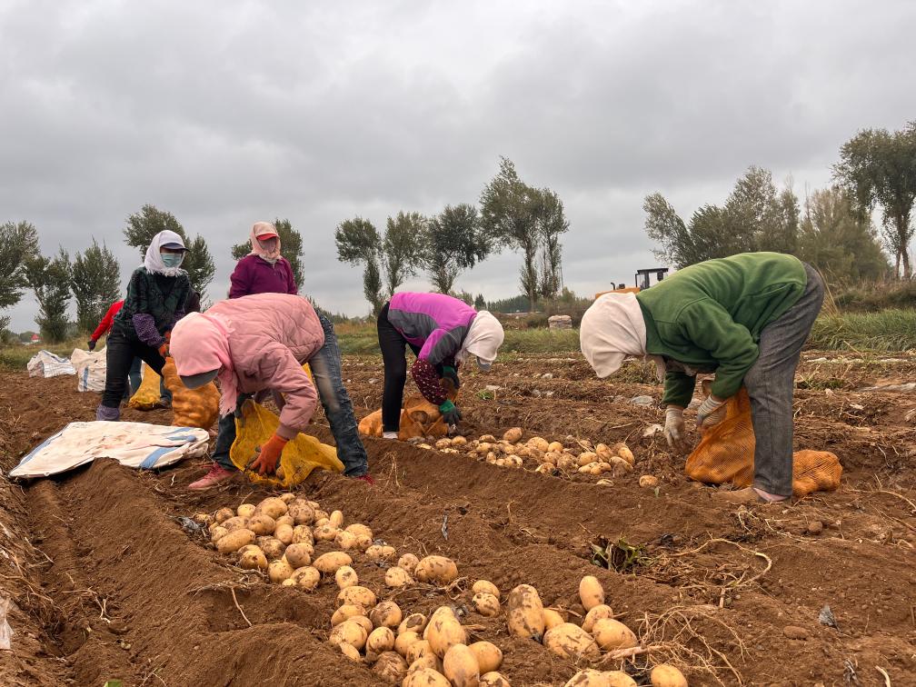 在甘肃省张掖市山丹县甘农薯7号绿色标准化连片示范基地里,村民正在捡收马铃薯。(受访者供图)