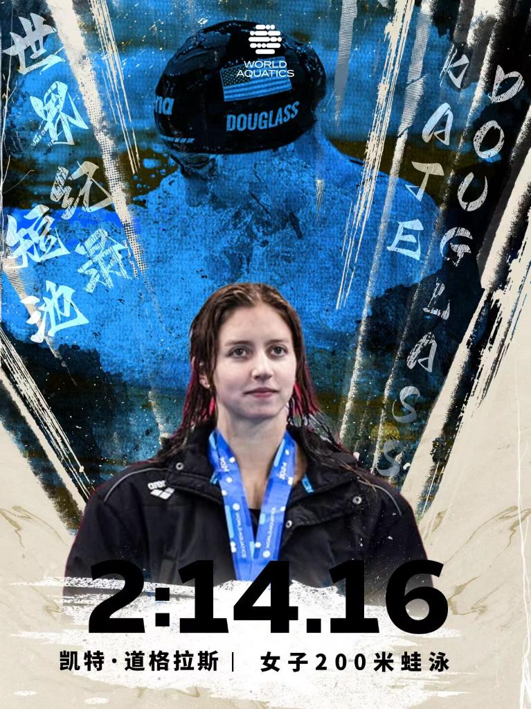 美国的奥运冠军道格拉斯在女子200米蛙泳决赛中以2分14秒16打破短池世界纪录并夺冠,她还在100米混合泳决赛中技压群芳夺魁,继续领跑世界杯女选手积分榜。
