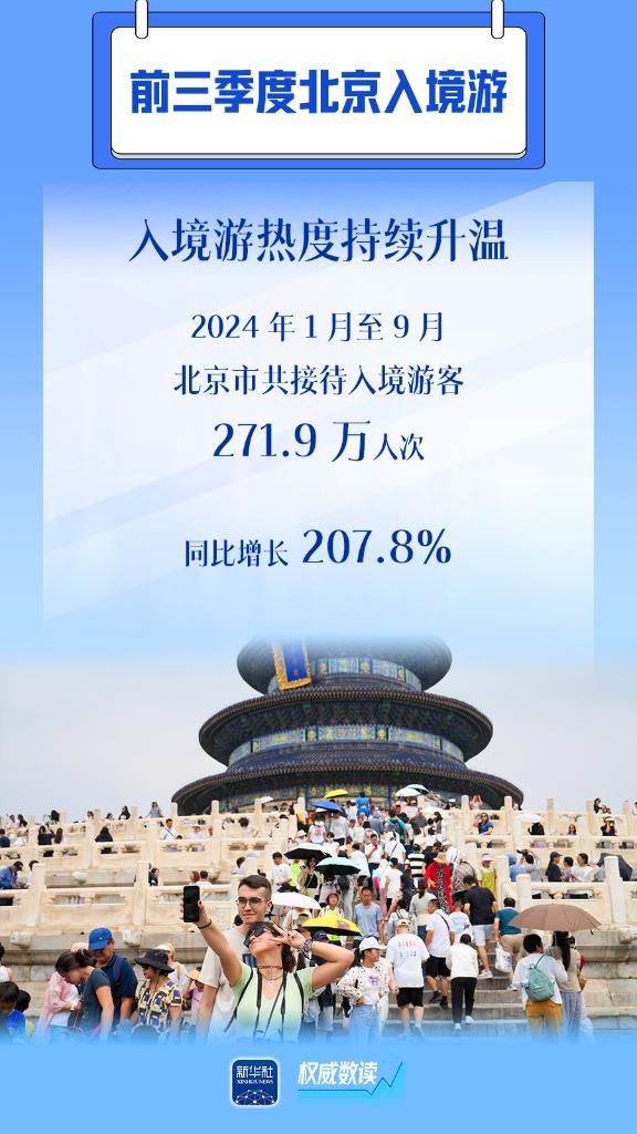 随着中国免签“朋友圈”持续扩容、便利人员往来措施不断优化,北京入境游市场加快恢复。北京市文化和旅游局日前发布数据显示,2024年1月至9月,北京共接待入境游客271.9万人次,同比增长207.8%。从单月恢复情况看,5月以来市场恢复速度加快,9月为年初以来的峰值,入境游客达38.4万人次,增长趋势明显,正逐步接近2019年同期水平。