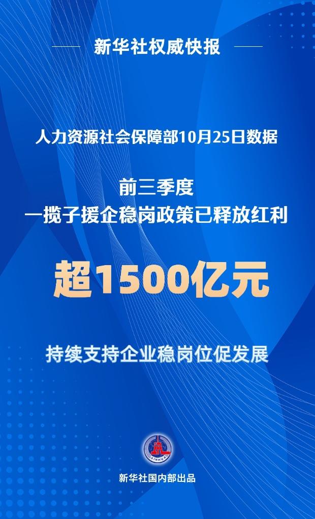 记者10月25日从人力资源社会保障部召开的新闻发布会上获悉,前三季度,一揽子援企稳岗政策已释放红利超1500亿元,持续支持企业稳岗位促发展。