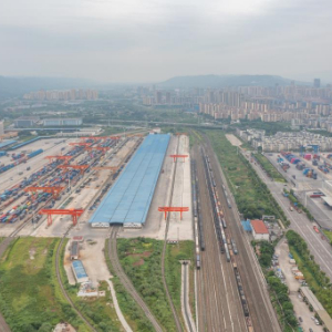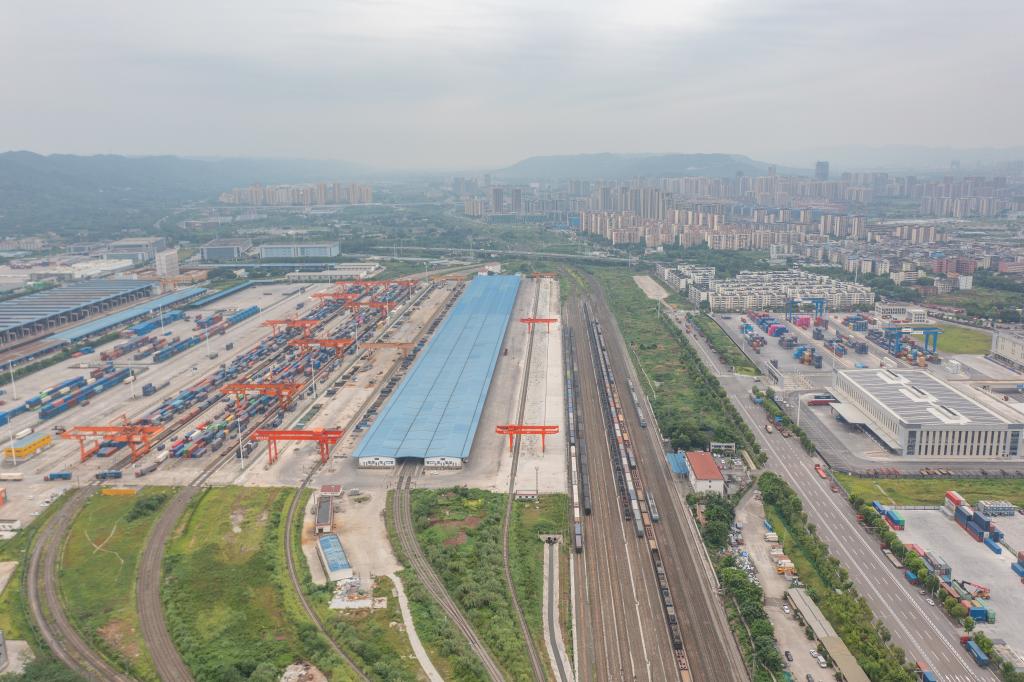 7月30日,在重庆国际物流枢纽园区,一列装载机械设备、汽车和笔记本电脑的中欧班列从重庆团结村中心站驶出(无人机照片)。新华社记者 黄伟 摄