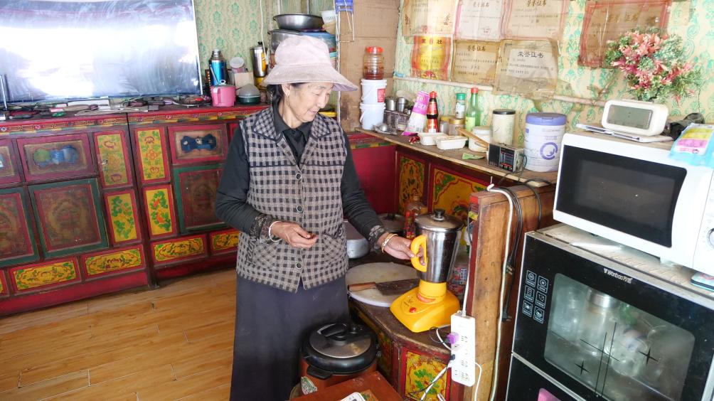 对琼国来说,生活中变化极大的就是生产酥油。“用电动酥油机,一桶奶几分钟就能打完,太省事了!”琼国家的冰箱里如今常备着二十几斤酥油。电动酥油机“上岗”后,酥油桶就闲置了。