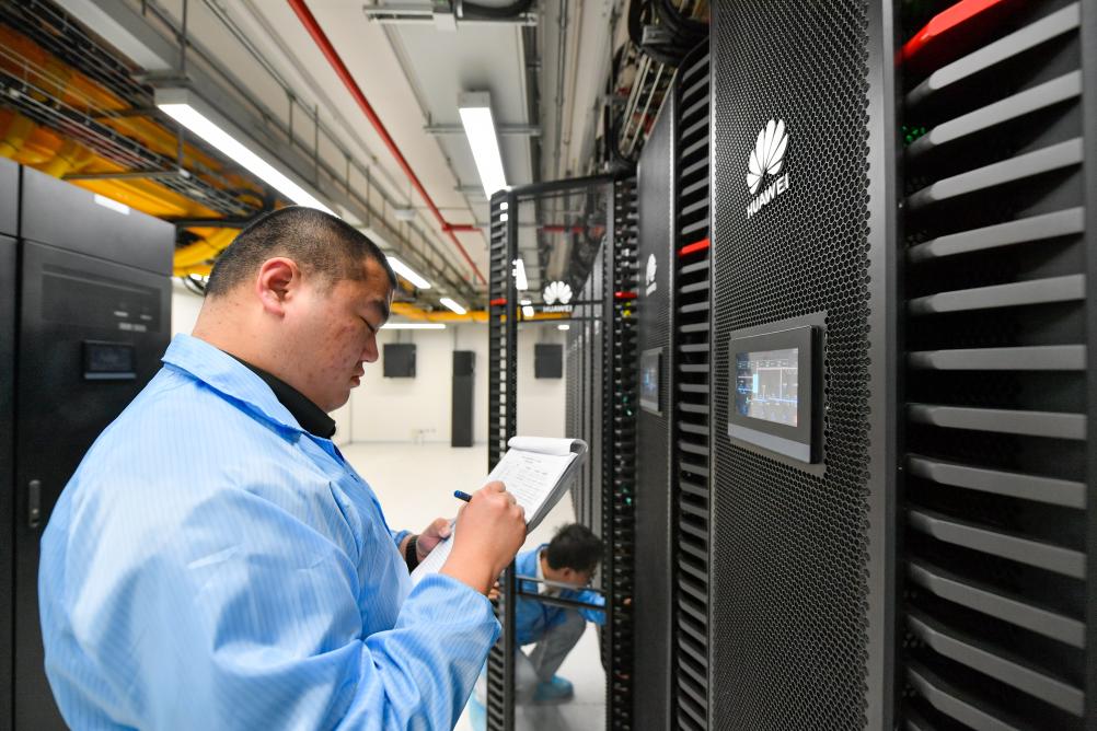 工程师在天津市人工智能计算中心对服务器设备运行温度进行人工核查记录。新华社记者 孙凡越 摄