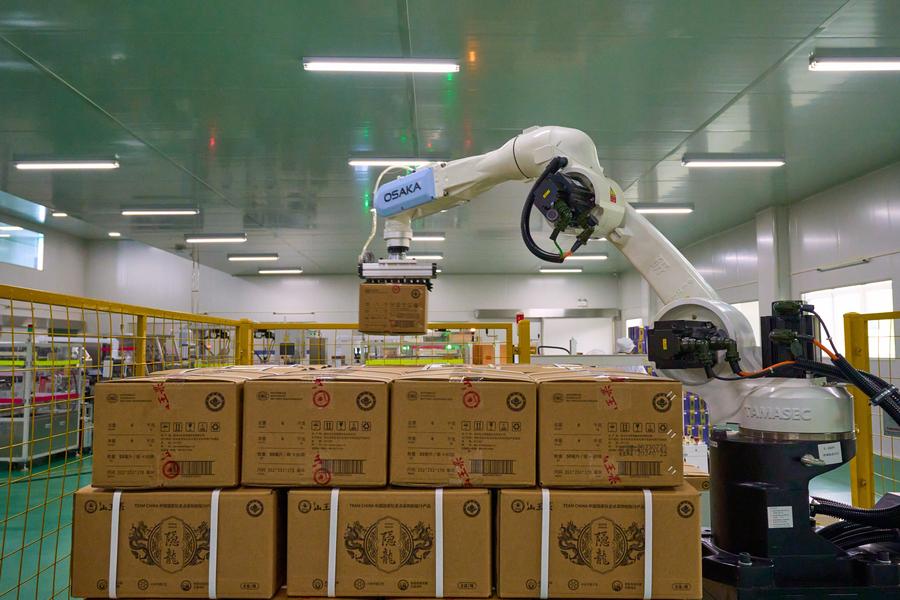 贵州山王果健康实业有限公司5G智慧工厂全自动包装线正在工作。(新华社发)
