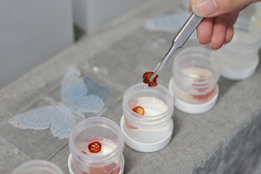 在清华大学展区,一排小型器皿中形状各异的物体吸引了不少参展商的目光。清华大学航天航空学院博士生章宋衍手持镊子轻轻夹起一片柔软的蝴蝶状水凝胶复合材料放入仪器中,这只柔软、好似正在飞舞的“蝴蝶”片刻后便固定成特定形状。