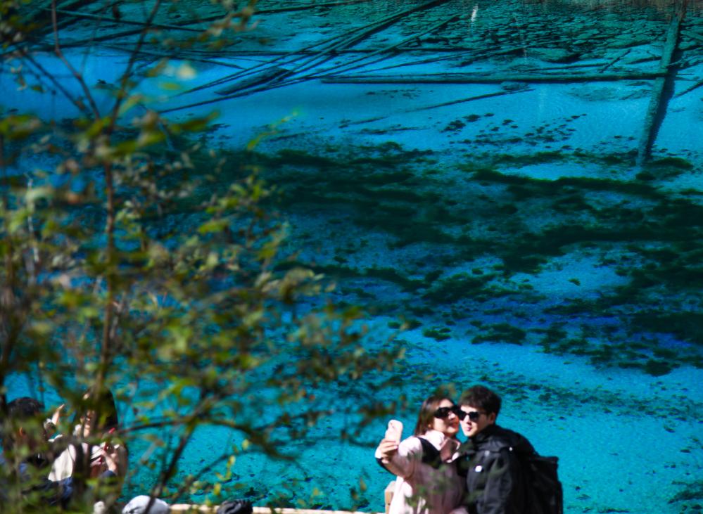 游客在九寨沟景区观光留影。新华社记者 王曦 摄