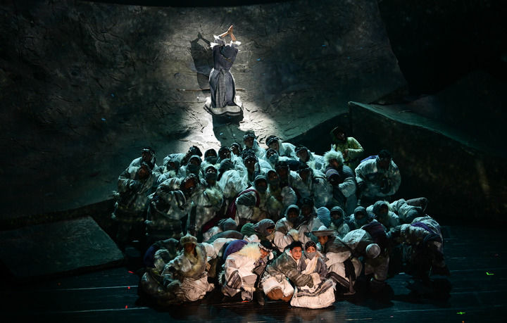 2023年6月5日,反映青海省海北藏族自治州海晏县牧民为了国防事业搬迁的舞剧《那时,金银花开》演员在青海大剧院表演。新华社记者 张龙 摄