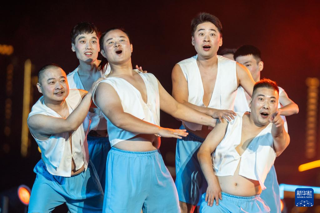 10月27日,在常德河街春秋广场,河南省三门峡梦飞合唱团的演员在表演节目《三门峡黄河船工号子》。新华社记者陈思汗 摄