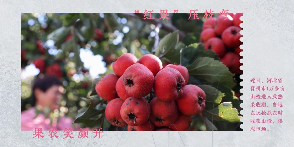 在河北省晋州市,1万多亩山楂进入成熟采收期,当地农民抢抓农时收获山楂,供应市场。近年来,晋州市因地制宜,积极引导农民通过“合作社+基地+农户”的模式,规模化种植山楂、梨、苹果等果树,促农增收,助力乡村振兴。
