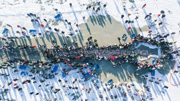 2021年12月26日,游客在查干湖冰面上近距离观看冬捕。新华社记者 颜麟蕴 摄