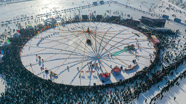 2023年12月28日,游客观看查干湖冬捕“祭湖醒网”仪式(无人机照片)。新华社记者 张楠 摄