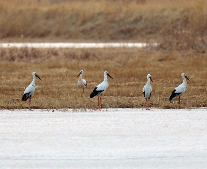 2020年3月22日,几只东方白鹳在查干湖岸边休息。新华社发