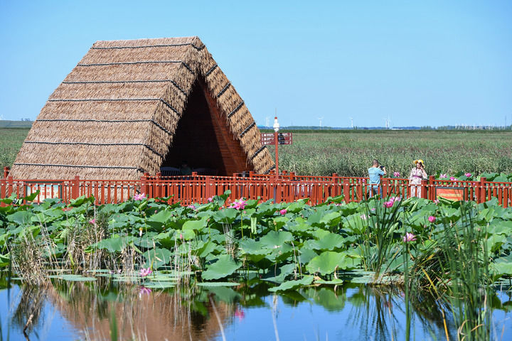 2024年8月26日,游客在查干湖参观游览。新华社记者 张楠 摄