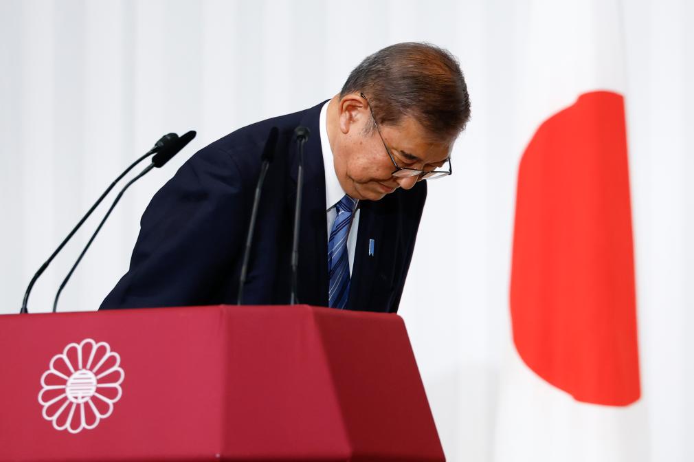 10月28日,在日本东京自民党总部,日本首相、自民党总裁石破茂结束在记者会上的讲话后向台上议员鞠躬。石破茂当地时间28日14时在自民党总部召开记者会,就执政联盟在众议院选举中败北表示诚挚接受选举结果,将继续进行政治改革。新华社发(Pool图片,金敬勋摄)