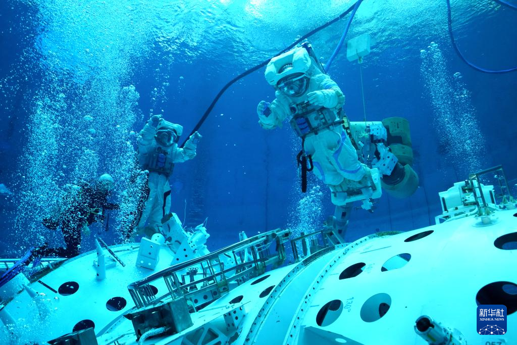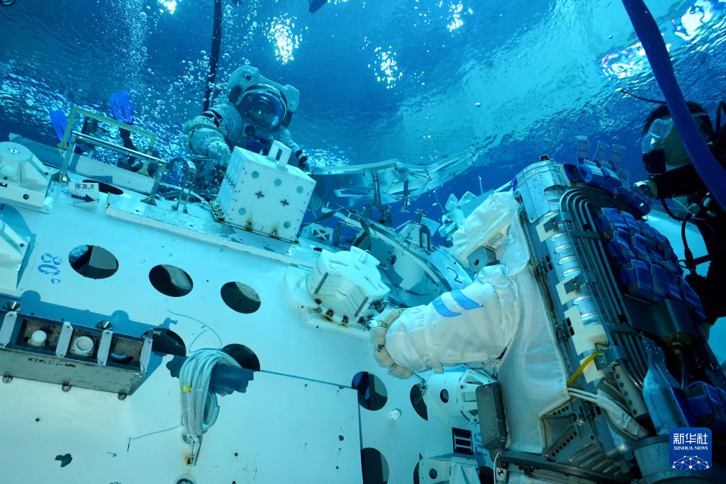 神舟十九号航天员蔡旭哲(上)和宋令东(下)进行水下训练(2024年9月2日摄)。新华社发(孔方舟摄)