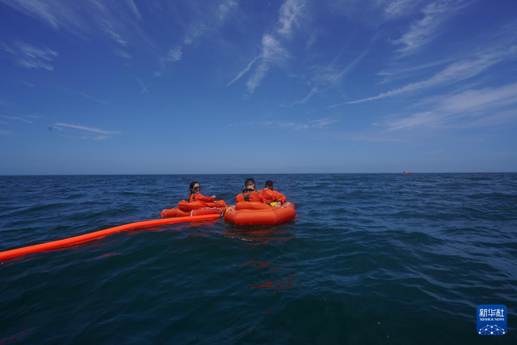 神舟十九号航天员王浩泽(左)进行海上救生训练(2023年7月2日摄)。新华社发(孔方舟摄)