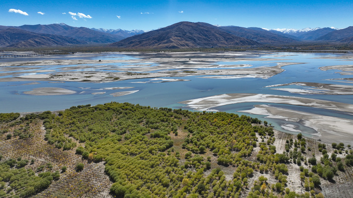 这是雅鲁藏布江宽阔的河床和岸边种植的树木。新华社记者晋美多吉 摄