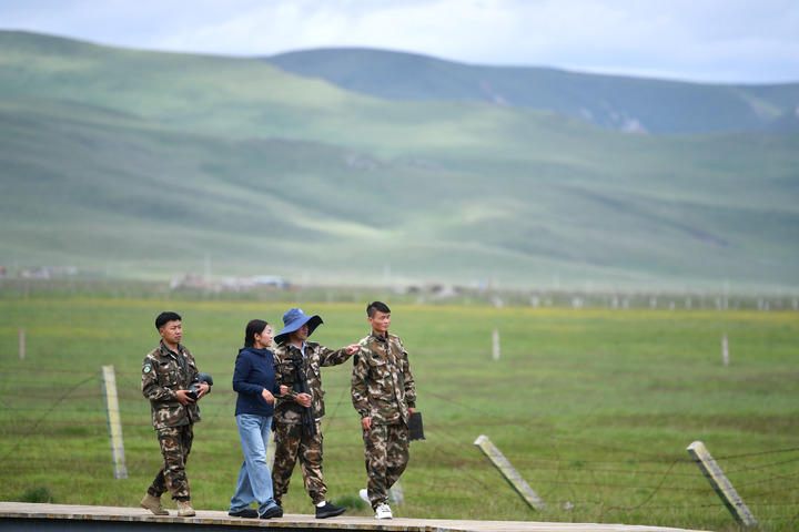在位于甘肃省甘南藏族自治州的尕海则岔国家级自然保护区,管护中心尕海保护站的工作人员在保护区内巡护(2023年7月7日摄)。新华社记者陈斌 摄