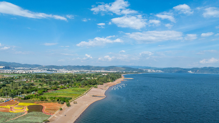 抚仙湖在蓝天白云的映衬下显得格外美丽。新华社记者胡超 摄