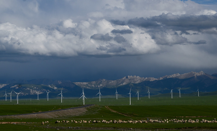 羊群在青海省海西蒙古族藏族自治州天峻草原的一处风电场附近漫步、吃草。新华社记者张龙 摄