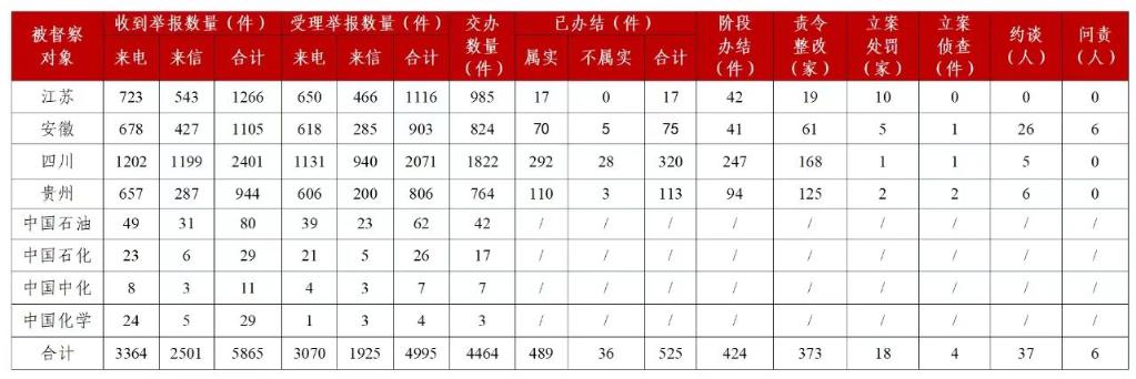 截至10月30日20时,各督察组共收到群众来电、来信举报5865件,受理有效举报4995件,经梳理合并重复举报,累计向被督察对象转办4464件。被督察对象已办结或阶段办结949件,其中立案处罚18家;立案侦查4件;约谈党政领导干部37人,问责党政领导干部6人。