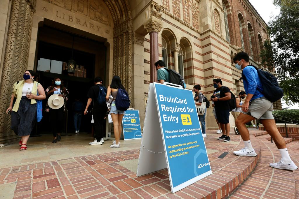2021年9月23日,学生们进入美国加州大学洛杉矶分校图书馆。新华社发