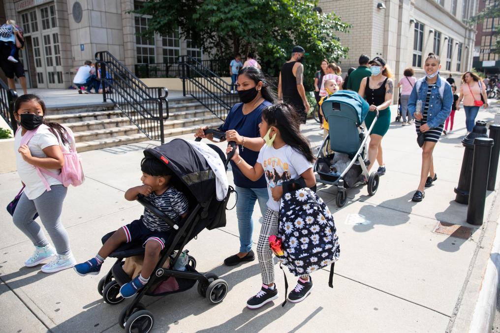 2021年9月13日,家长在美国纽约一所公立学校外接学生放学。新华社发 (郭克摄)