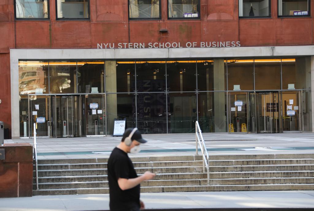 2020年7月14日,一名男子从美国纽约大学的教学楼前走过。新华社记者王迎摄