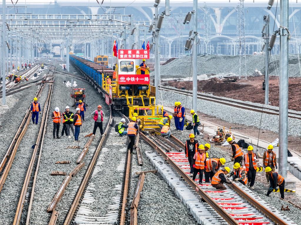 新华社重庆11月2日电(记者唐奕)11月2日,在渝厦高铁重庆东站施工现场,随着中铁十一局工人将第一组500米长钢轨铺设在路基上,西部地区最大高铁枢纽站——重庆东站进入正线铺轨阶段,渝厦高铁重庆东至黔江段铺轨工程是由该枢纽站铺设引出的第一条线路。