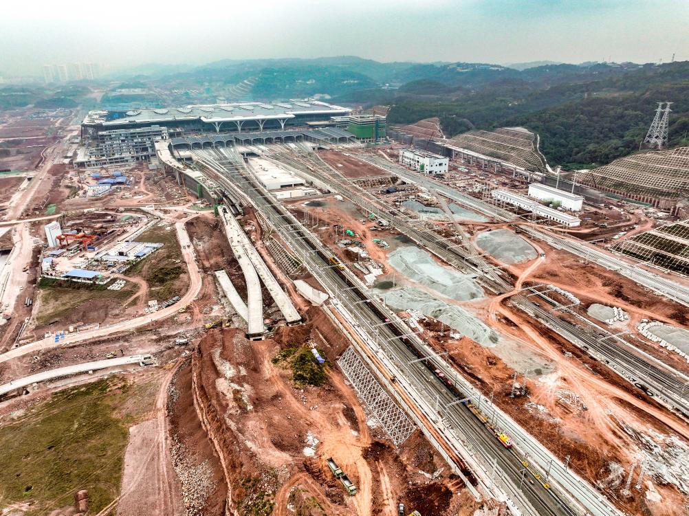 这是11月2日拍摄的渝厦高铁重庆东站正线铺轨施工现场(无人机照片)。新华社记者 唐奕 摄