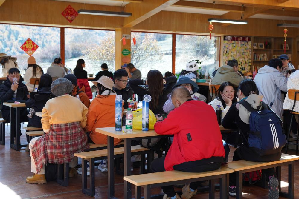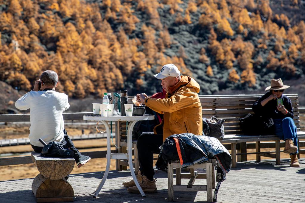 10月31日,在四川省甘孜藏族自治州的稻城亚丁景区,游客在“亚丁驿站”用餐、休息。新华社记者 储加音 摄