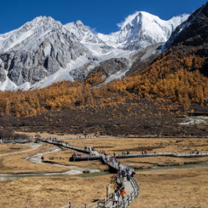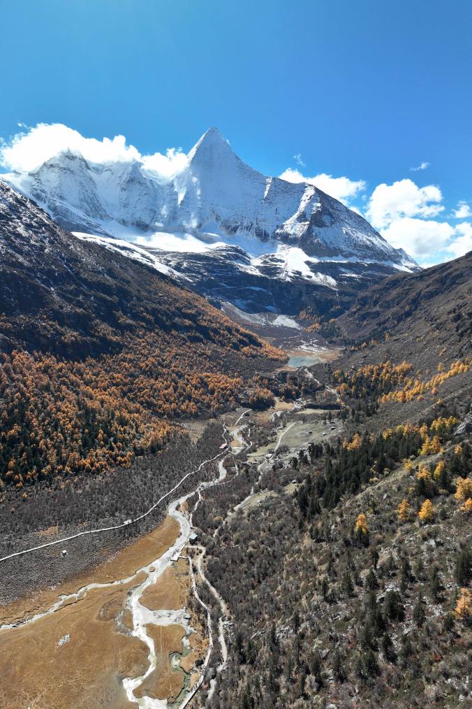 近日,位于四川省甘孜藏族自治州的稻城亚丁景区秋韵正浓,吸引众多游客前来游览。