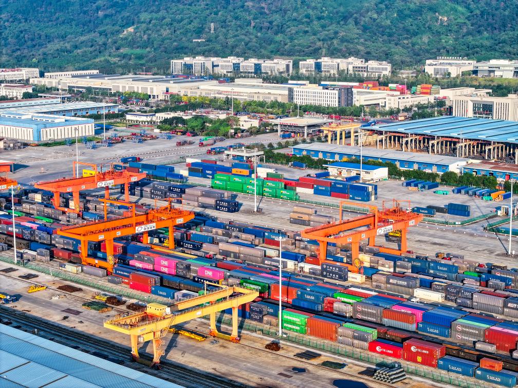 一列铁海联运班列驶出广西钦州港(10月24日摄,无人机照片)。新华社记者 张爱林 摄