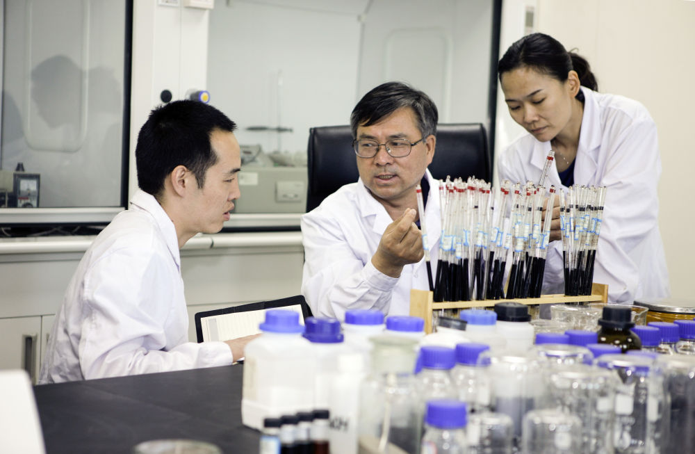 大庆油田科研工作者伍晓林(中)在进行表面活性剂研制实验(2019年6月20日摄)。新华社发(赵永安 摄)