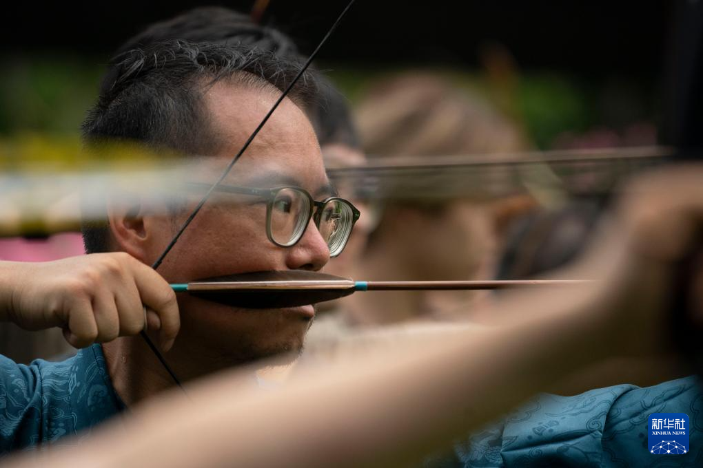 身着红蓝相间汉服的弓会教练谢卓殷,颇有书生气质。他自小热衷阅读古籍,了解到西周时期,射礼竞赛发展出了一套完备的规则系统,其中最为精妙的环节还要求弓手配合音乐节拍进行射箭。