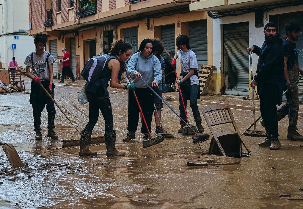 11月1日,在西班牙巴伦西亚省,人们在街道上进行清理工作。新华社发(巴勃罗·莫拉诺摄)