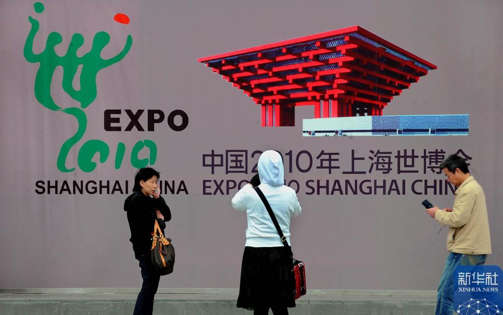 2010年4月22日,在上海街头,三位市民在一面世博会宣传墙前,分别用手机打电话、看信息、拍照片。