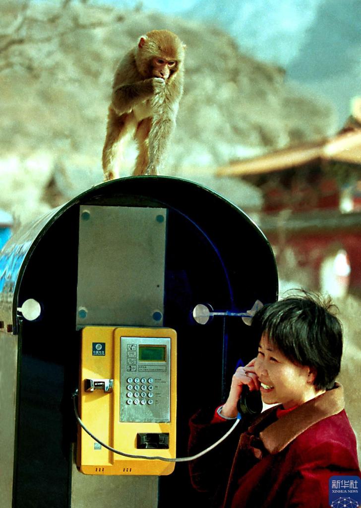 2001年3月16日,在河南省济源市五龙口风景区,一位游客在公用电话亭前拨打电话,一只好奇的猕猴在“偷窥”。