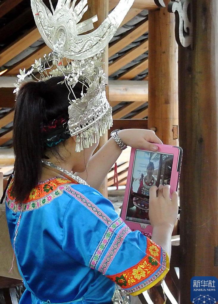 2012年7月24日,在贵州省西江千户苗寨景区,一位游客用平板电脑将刚拍摄的照片传发到网上。