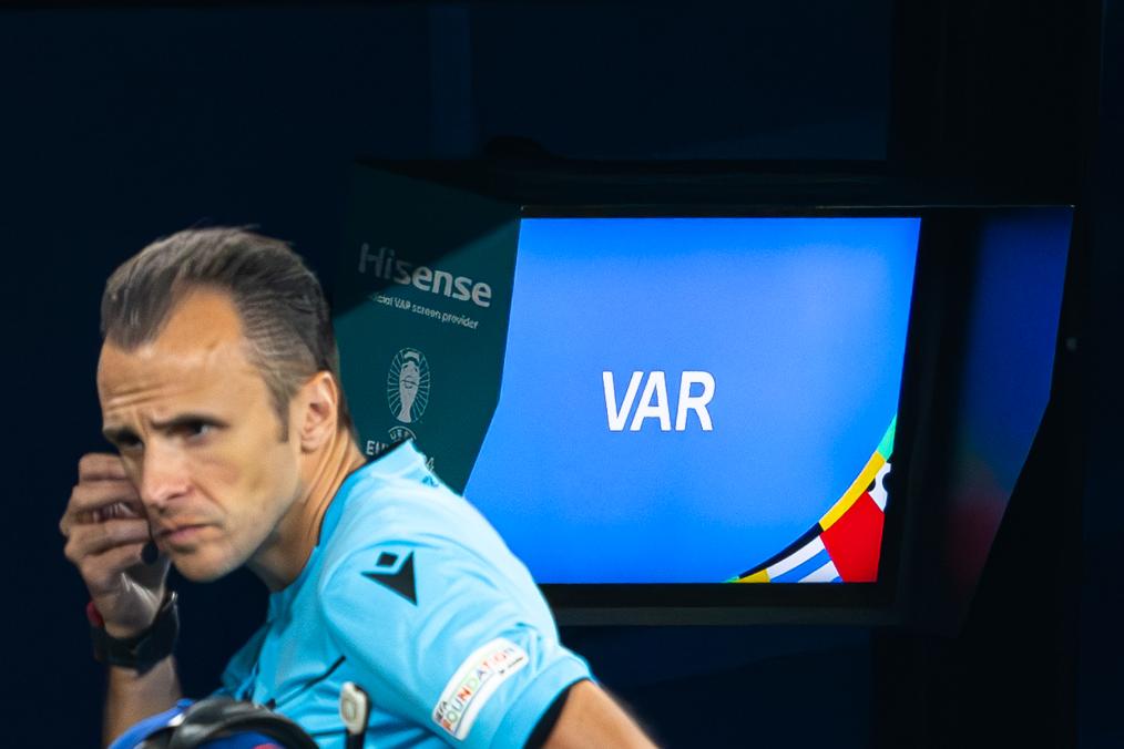 6月29日,在德国多特蒙德举行的2024欧洲足球锦标赛八分之一比赛中,边裁在场边等待VAR(视频助理裁判)的查看结果。新华社记者 肖艺九 摄
